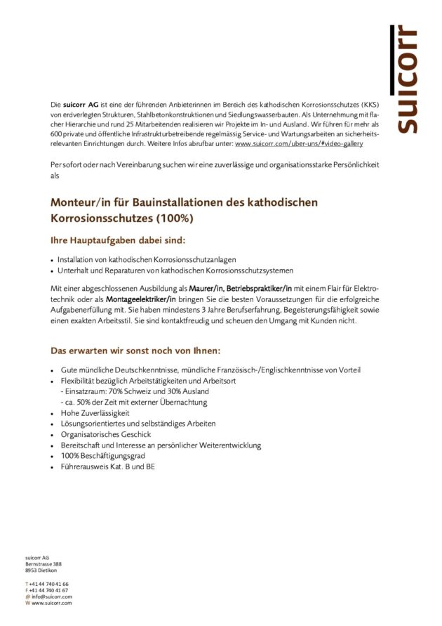 Monteurin für Bauinstallationen des kathodischen Korrosionsschutzes (100%)